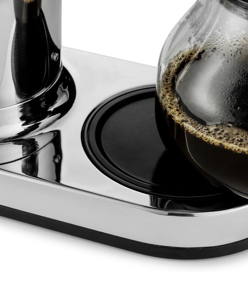Engineered to avoid burnt notes, the hot plate adjusts the power depending on the water volume and gradually tapers down over 40 minutes. To save energy, it shuts off when the glass carafe is removed.