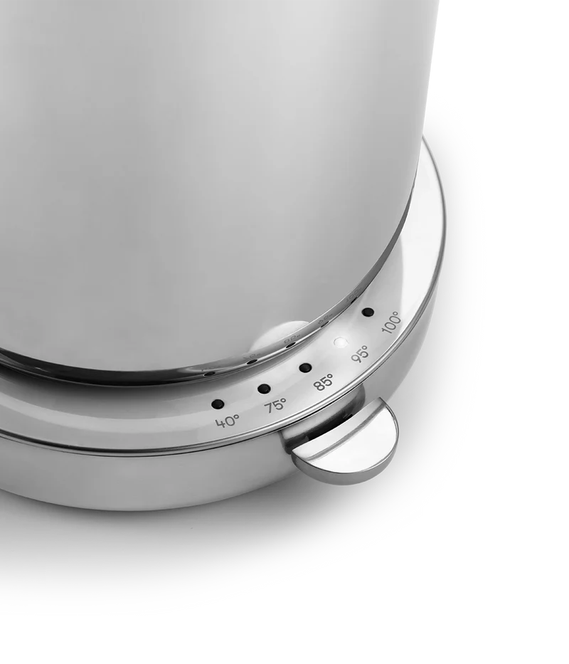 This electric kettle boasts variable temperature settings: 40°, 75°, 85°, 95° and 100°C. We added a memory function for extra convenience - the Kettle will remember the setting you picked last time.